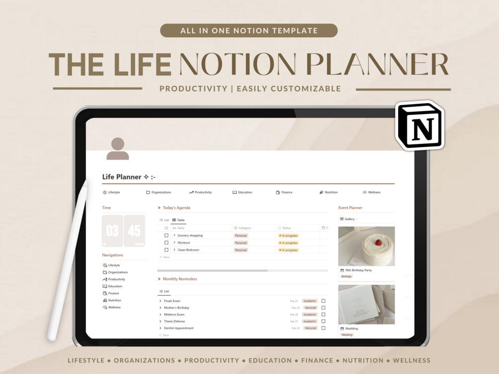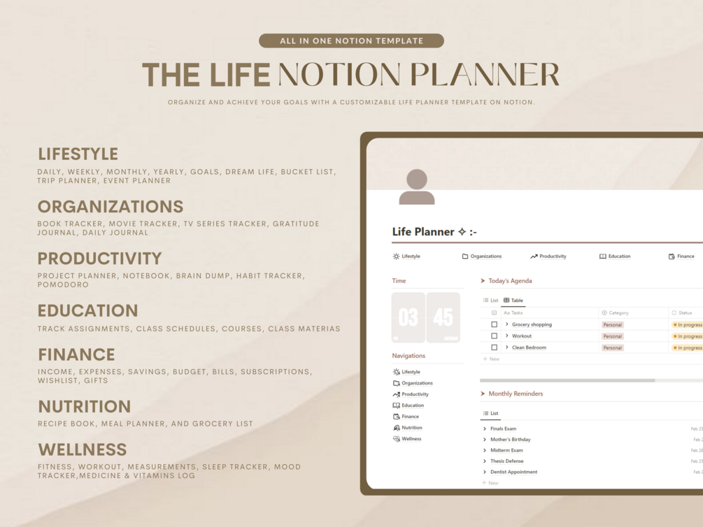 Introducing our all-in-one Notion template for better organization and productivity. Streamline your agendas, finances, nutrition, and wellness in one place.